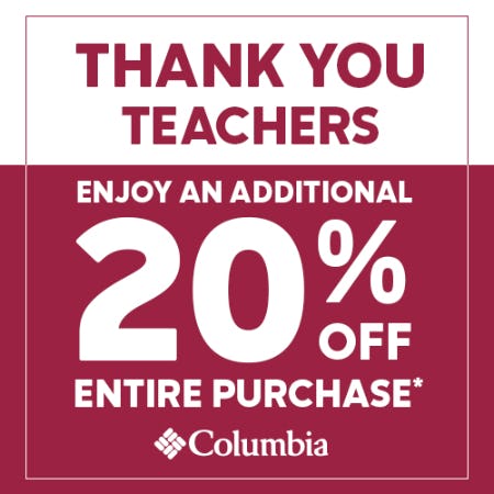 Active and retired teacher receive 20% off (before tax) at select participating Columbia-owned stores in U.S. and Canada 09/25/2025 through 10/05/25.