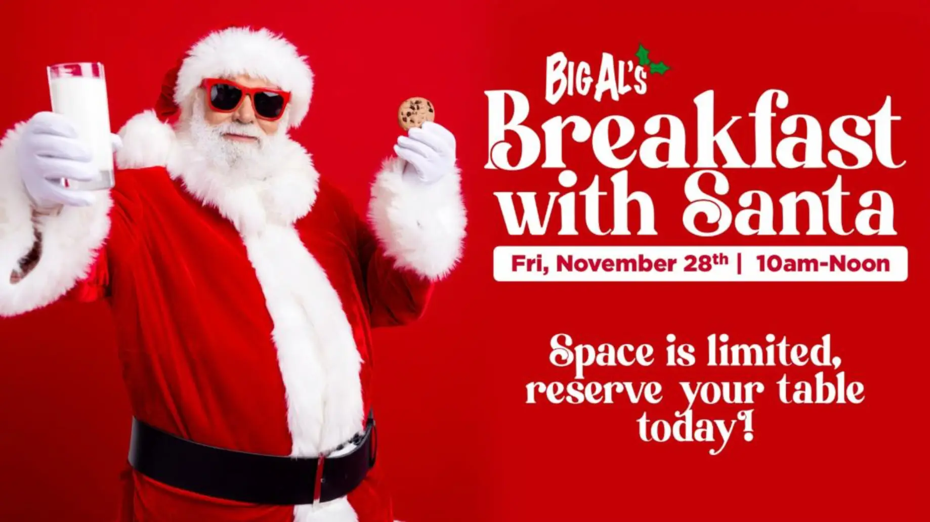 Join us for Breakfast with Santa at Big Al's Meridian on Friday, November 28th from 10AM-12PM! We'll be serving up a holiday-themed buffet including all your breakfast favorites! You'll have a chance to take a picture with Santa as well as visit his reindeer who will be making a special appearance!